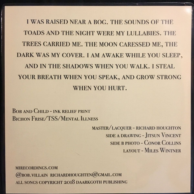 A 7" of Far to Go & Next Week from the experimental Los Angeles musician Bob Villain. Pressed on Clear Red Vinyl, a print of TSS Bichon Frise's Bob and Child wood block print is the backing art.